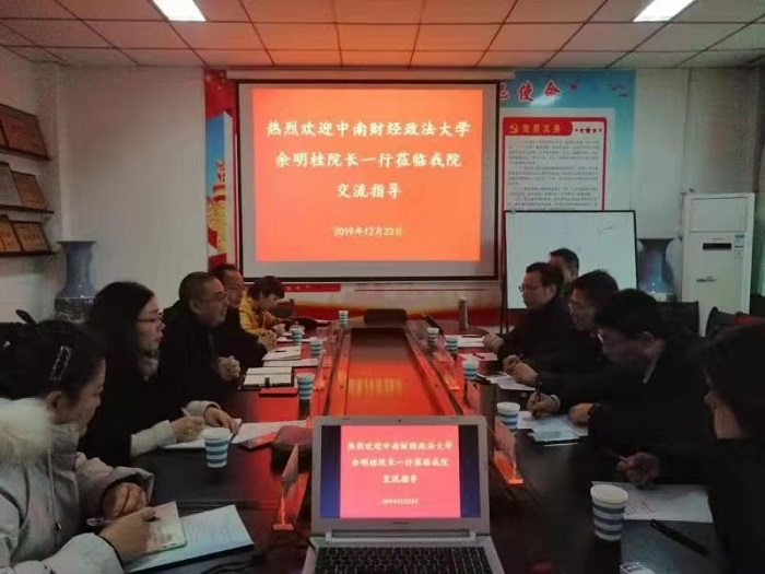 2019年12月23日上午,中南财经政法大学金融学院一行,在院长余明桂带带领下,到我校必赢242net官网商谈深度合作事宜。并在必赢242net官网会议室召开工作推进会议,院长黄良杰,副院长邵翠丽、贾宪军、王培玲、牧业金融研究院副院长宋晓薇参加了会议。会议由必赢242net官网副院长贾宪军主持。