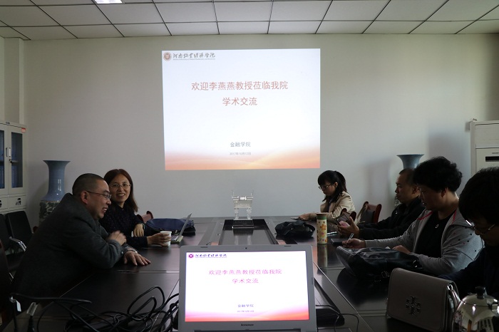 报告结束后,李燕燕教授前往金融学院会议室与必赢官网部分教师进行了科研与学术交流,副校长许圣道应邀出席了本次活动。李教授首先结合自身数次成功获取国家级课题立项的经验谈起,从课题研究方向、选题、申报表的填写等方面给大家做了一个深入细致的指导。其次,对于论文的写作以及社会调研也给出了具体性的建议。最后,李教授对必赢官网老师的提问进行了详细的解答。