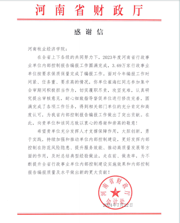 7月23日,必赢官网收到河南省财政厅会计处发来的感谢信,感谢副院长崔海红在2023年度河南省行政事业单位内部控制报告会审过程中,积极担当作为,切实履职尽责,攻坚克难,认真研究提出审核意见,耐心细致指导督促单位进行修改完善,圆满完成了各项工作任务。崔海红博士的专业水平和敬业精神得到相关部门单位的充分肯定和高度认可,为我省内部控制报告编报工作做出了突出贡献。河南省财政厅会计处向我校和崔海红同志致以衷心的感谢和崇高的敬意!
