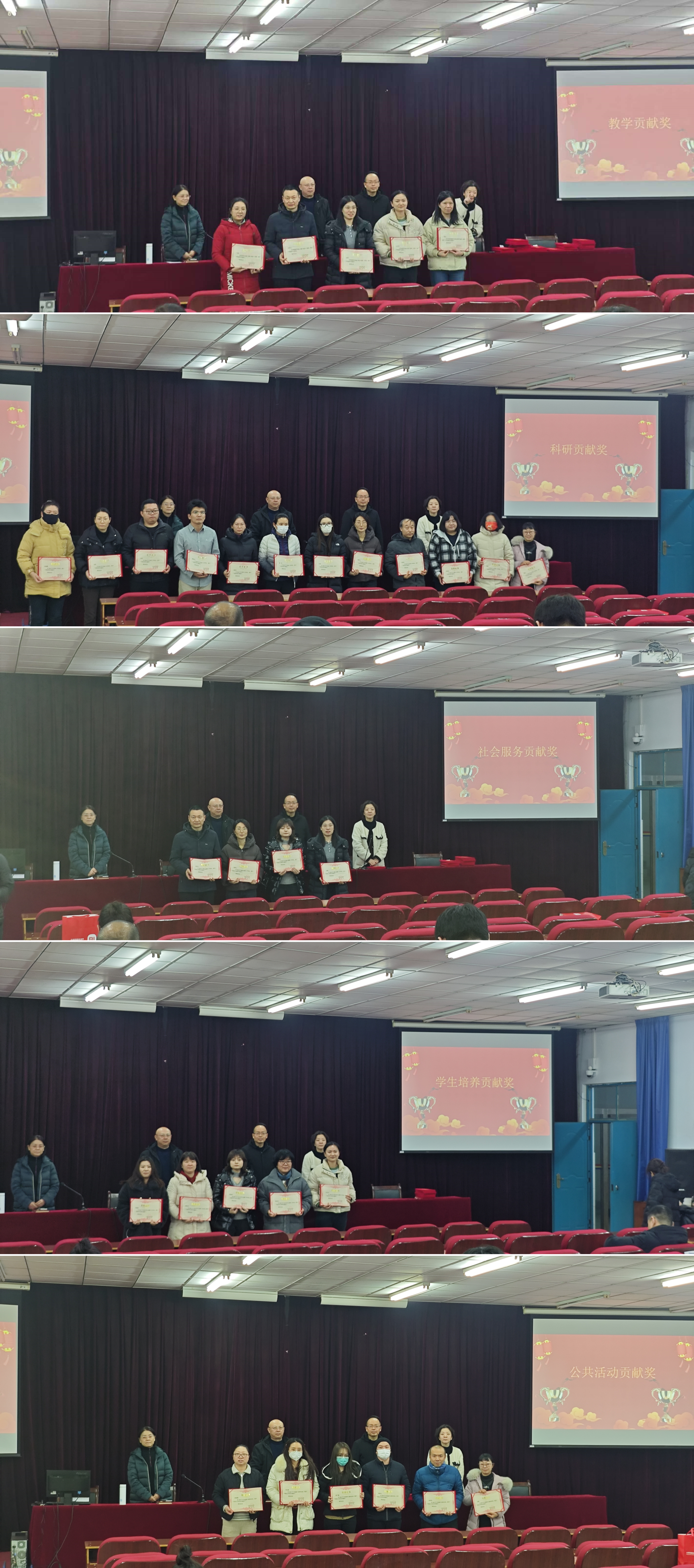为表彰先进,营造干事创业良好氛围,学院设立年度学院发展贡献奖,表彰在教学、科研、社会服务、学生就业与培养、公共活动等方面为学院做出突出贡献的教师和团队。副院长崔海红宣读了2024年学院贡献奖获奖名单;学院领导为获奖者颁发了荣誉证书和奖品,现场气氛热烈,掌声不断。获奖者们纷纷表示,将继续努力工作,为学院的发展贡献自己的力量。