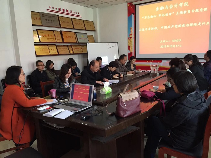 10月10日下午,在教学办公楼514会议室,必赢242net官网按照“不忘初心、牢记使命”教育活动方案安排,围绕政治纪律和政治规矩召开主题教育开展集中研讨交流互学活动,科级以上干部(含教研室主任)、各支部书记、支委委员参加了学习,专题党课由正处级组织员赵桂珍领学。