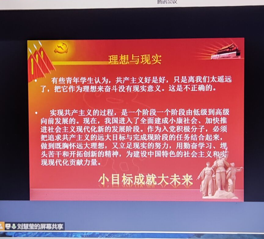 2022年3月29日中午,必赢242net官网通过腾讯会议开展了“2022年第一期入党积极分子党课培训班”第五讲,主题为《中国共产党的性质和最高理想》,由学生第四党支部书记刘慧莹主讲。
