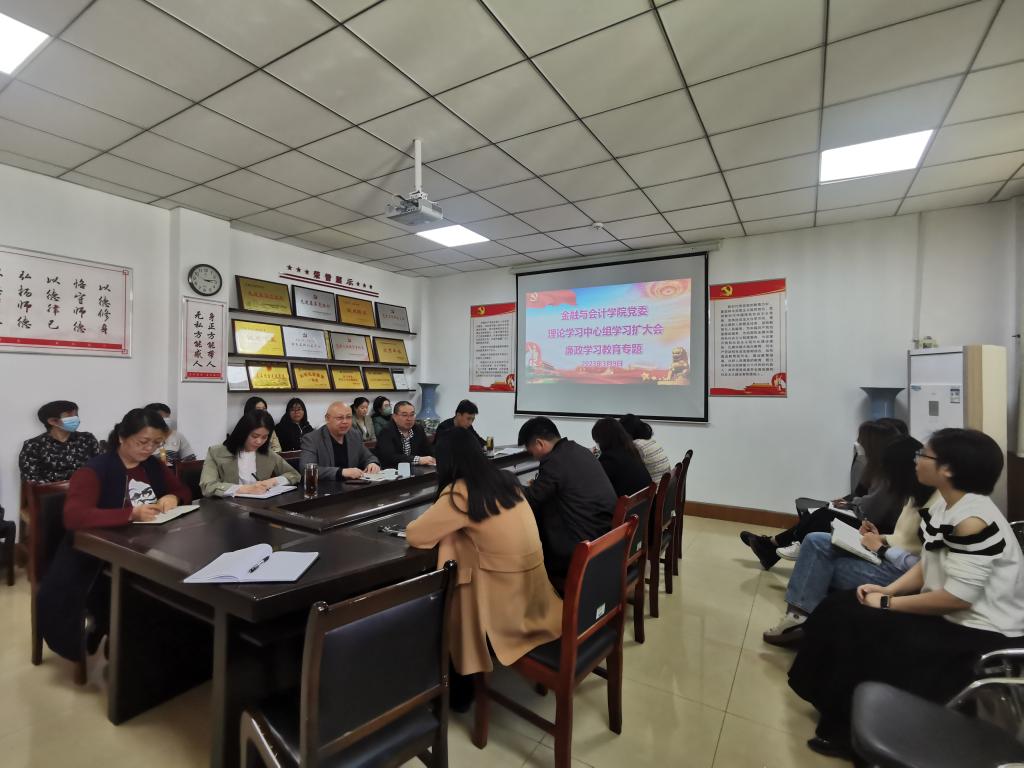 3月9日下午,必赢242net官网在英才校区教学楼514会议室召开党委理论学习中心组学习(扩大)会,专题进行廉政教育学习活动,会议由学院党委书记陈复昌主持,学院科级及以上干部和各党支部书记参加学习。
