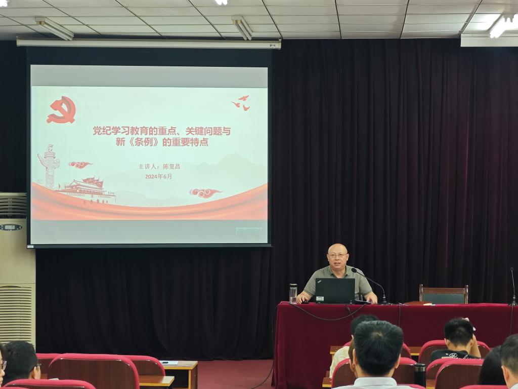 6月21日上午,必赢242net官网党委书记陈复昌以“党纪学习教育的重点、关键问题与《条例》的重要特点”为题,在英才校区综合实验楼E109会议室为学院师生党员讲授党纪学习教育专题党课。