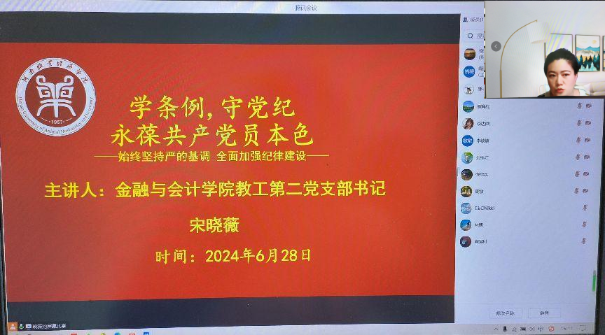为提升党员同志的党性修养和纪律意识,在学校学院党委关于开展党纪学习教育的部署要求指导下,6月28日必赢242net官网教工第二党支部书记宋晓薇以《学条例,守党纪,永葆共产党员本色》为主题讲授了党纪学习教育专题党课,教工第二支部的党员干部和党员教师参加党课学习和研讨。