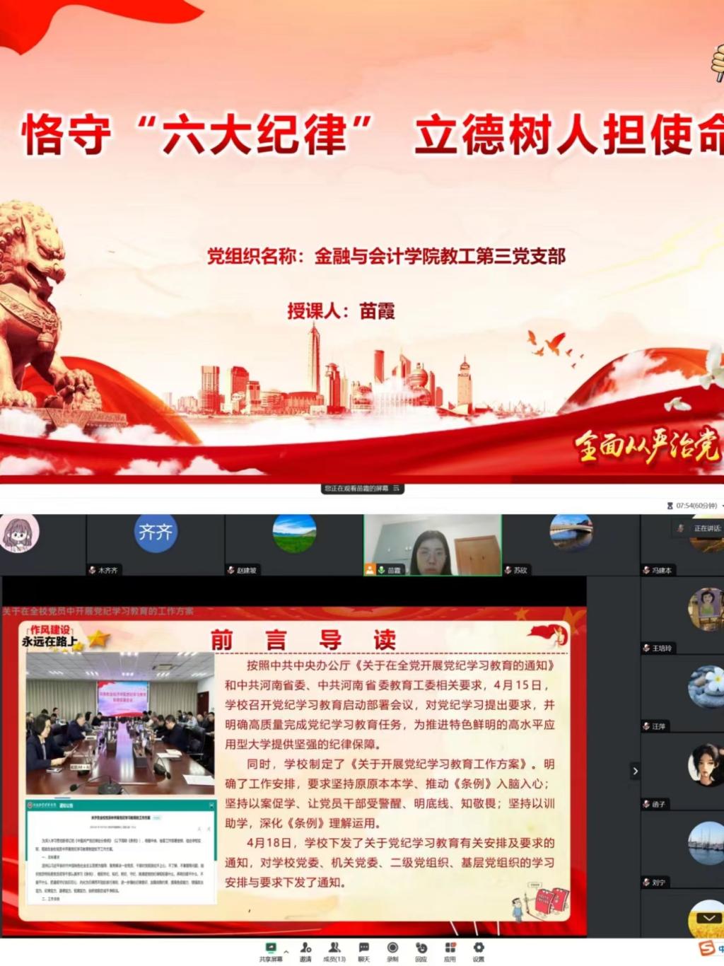 为进一步强化党纪学习教育效果,推动党纪学习教育走深走实,强化支部党员教师纪律意识,为学校事业高质量发展提供坚强纪律保障,2024年6月28日上午,必赢242net官网教工第三党支部书记苗霞同志以“恪守六大纪律、立德树人担使命”为主题开展党课活动,支部全体党员教师参加了学习与研讨。