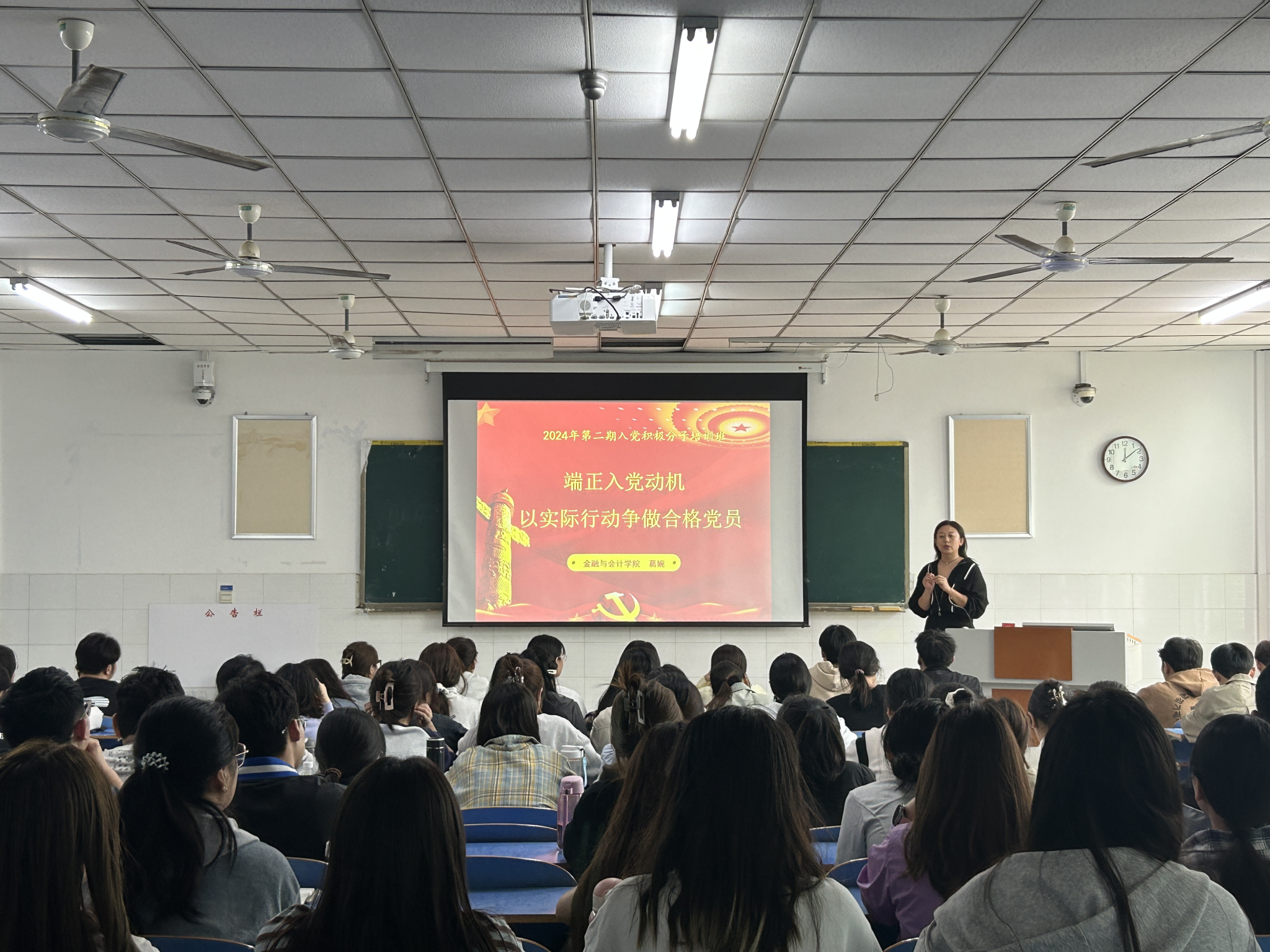 为进一步提高入党积极分子思想觉悟,端正入党动机,10月16日中午,必赢242net官网在E205教室举行2024年第二期入党积极分子培训班第四讲——《端正入党动机以实际行动争做合格党员》,本次党课由学生第二党支部书记葛婉主讲。