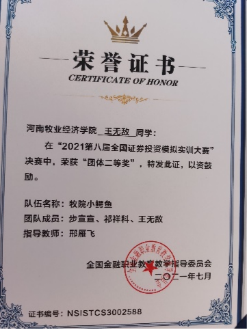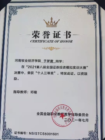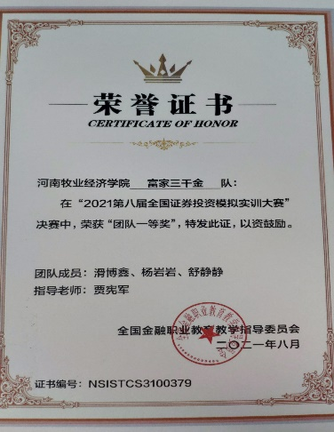 本次大赛共有来自全国589所院校,21046支队伍,65673人参赛。比赛历时3个月,从报名阶段开始院领导就高度重视,副院长贾宪军带队,选拔出186名学生及9名教师,组成52个团队参赛。3个月以来,历经了学生动员培训会、教师多次精心指导、学生不断优化策略、突围区域选拔赛、挺进决赛,最终把握大势、精准交易、强化风险,获得了一个团体一等奖、四个团体二等奖、六个团体三等奖,以及五个个人一等奖和二等奖,创必赢官网参赛以来的最好成绩。
