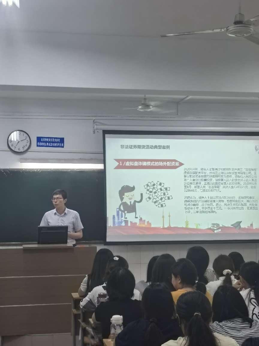 讲座伊始,时雷雷讲师首先以金融市场中存在的“虚拟盘诈骗模式的场外配资案”、“非法发行股票案”、“非法荐股案”、“外盘期货”、“伪私募”、“场外个股期权的诈骗陷阱”等一系列案例为引导,一一对案例展开分析,并用亲身实务经历引导学生了解金融风险案例背后的底层逻辑和常见的“套路与特征”,从而帮助同学有效识别风险、防范风险,并得出“投资六不”和“防非八大提示”的防风险原则,进一步与同学们分享交流了应该如何将理论知识与实操技能相结合,进而在自身的专业课程学习中找到侧重点和着力点。