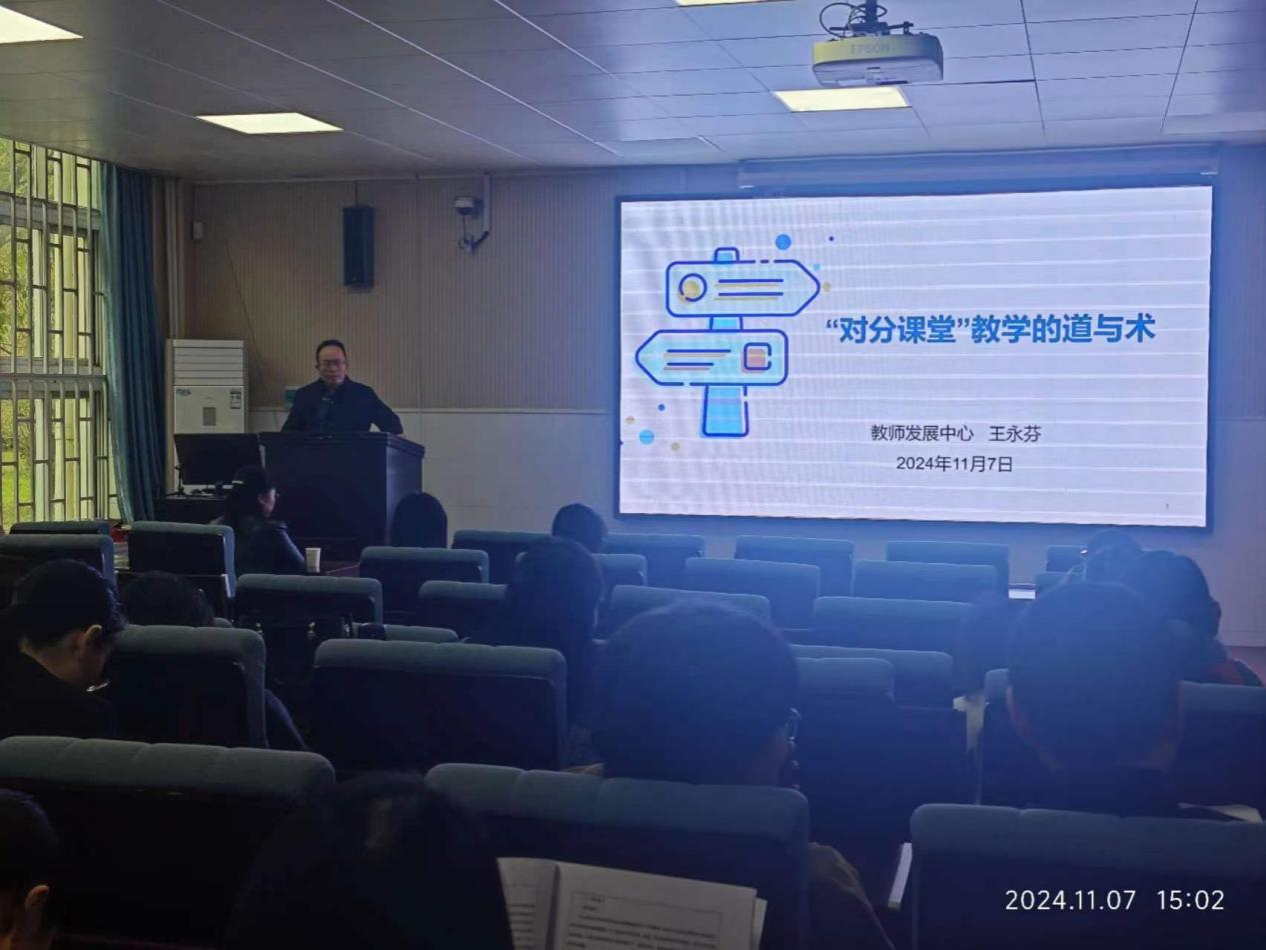 为不断更新必赢官网教师教育教学理念、探索课堂教学的新理念和新方法。提高教师教学技能水平,助力必赢官网教育教学高质量发展。由必赢官网和教师发展中心主办的专题讲座《对分课堂教学的道与术》于11月7日(本周四)下午3点于英才校区w102顺利开展。本次讲座由我校教师发展中心主任王永芬教授主讲,由必赢242net官网院长贾宪军主持,全体教师参加了本次讲座。