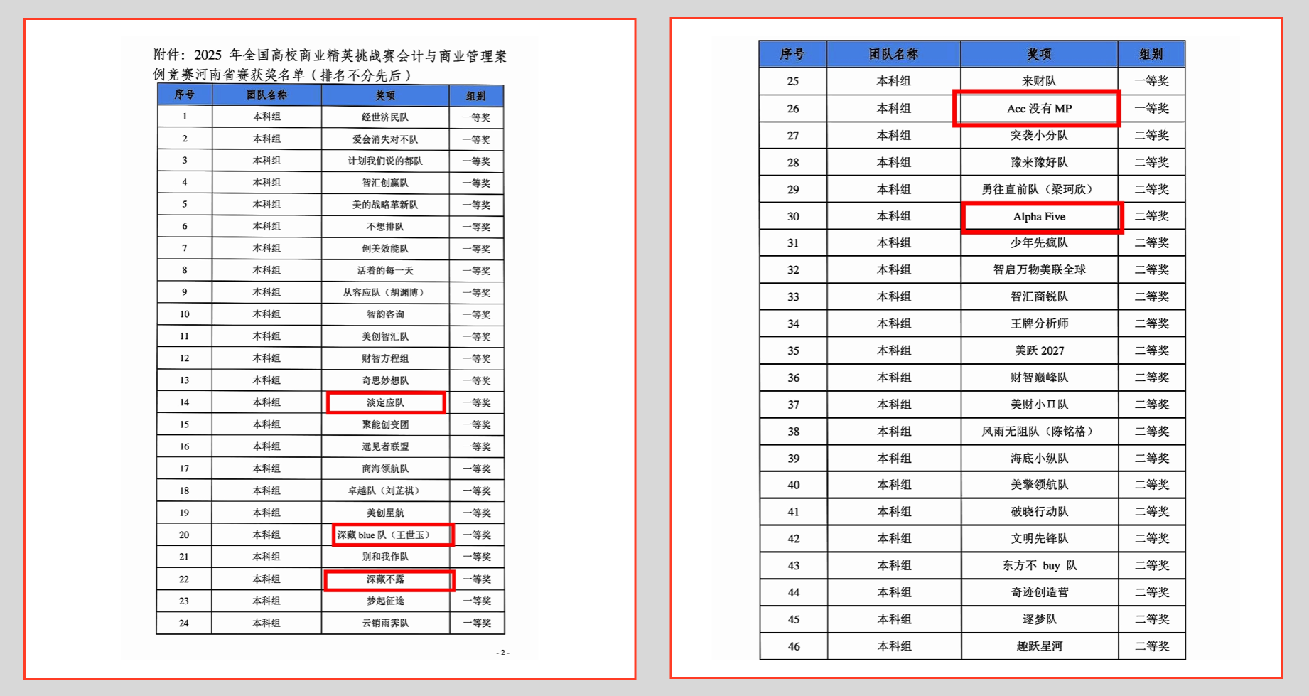 近日,2025年全国高校商业精英挑战赛会计与商业管理案例竞赛河南省选拔赛圆满落幕。经过知识赛、校赛、区域赛的激烈角逐,必赢242net官网学生组成的代表队,在指导老师蒋淼怡、林博、王平平的带领下,凭借扎实的专业知识、出色的团队协作和卓越的创新能力,斩获省赛一等奖4项、二等奖1项、三等奖5项的优异成绩。其中,获得一等奖的团队将代表河南省参加全国总决赛,向更高荣誉发起冲击。