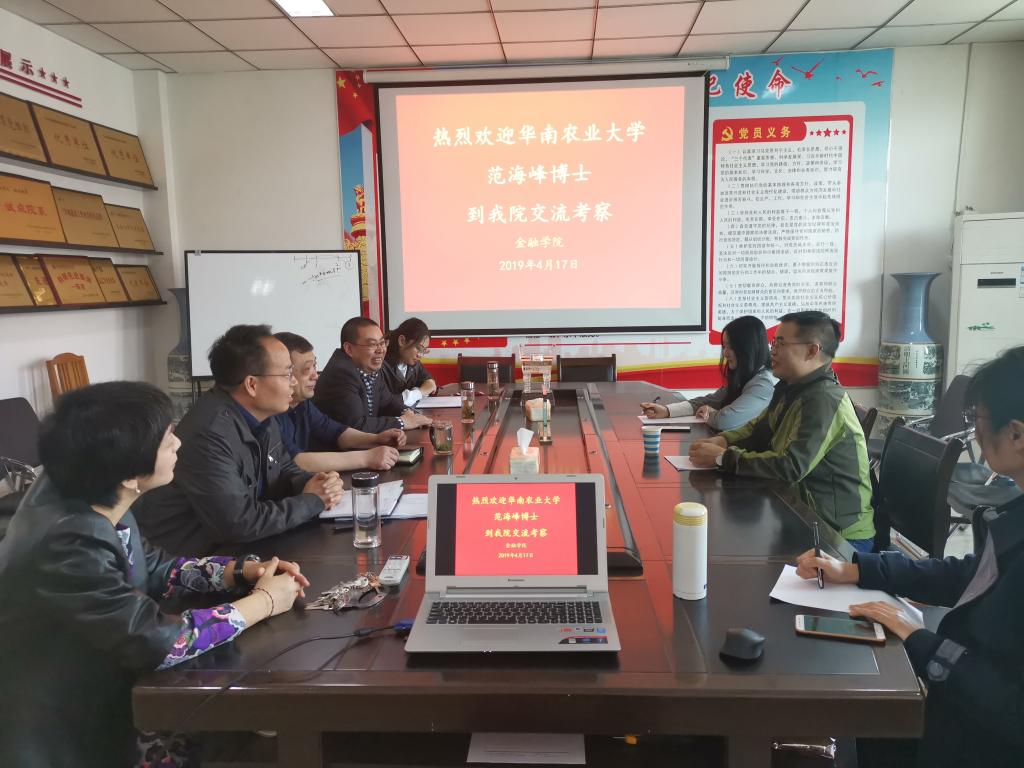 2019年4月17日,应金融学院的邀请,华南农业大学副教授、硕士生导师范海峰博士在英才校区办公楼514会议室就学科专业建设、教研科研方面和必赢官网部分教师进行了交流,金融学院班子成员参加了座谈会。