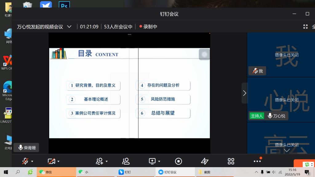 答辩分为论文陈述环节和答辩环节。在论文陈述环节,学生利用钉钉在线课堂,通过展示PPT,重点介绍论文选题意义、研究思路、研究内容及研究结论等;在论文答辩环节,答辩组老师坚持“问题导向”,指导学生运用专业知识,完善逻辑架构,拓展分析深度,解决实践问题,为进一步完善论文提出建议。答辩结束后各小组坚持客观公正,严格审核把关的原则,按照规范标准确定答辩结果,对学生答辩成绩进行了认真讨论与综合评定,并对答辩过程性资料进行整理保存。