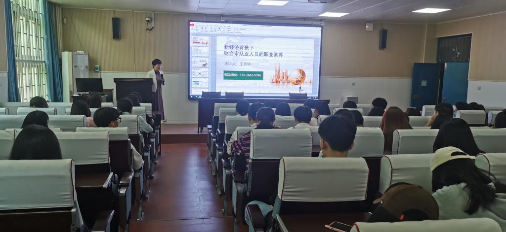 讲座开始前,必赢242net官网院长黄良杰教授为王延华总经理颁发了“校外实习指导老师”聘书。王延华总经理从新经济的内涵,新经济下的“放管服”经济改革,“十四五”时期会计改革与发展方向,财会专业大学生就业形势,新经济背景下财会从业人员的职业素养等几方面进行展开讲解。她讲道,“新技术”、“新模式”、“新制度”、“新文化”相互 影响、协同演化,构成了当代语境下我国新经济时代的主要内涵。“放管服”经济改革的的发展趋势,环境日趋完善,服务人性化、高效化,管理精准化、科学化、法治化。她结合多年丰富的实践经验,分析行业发展变革中面临的机遇和挑战,特别指出在工作中需要坚守道德底线,提升专业水准。鼓励同学们要确定职业生涯目标,树立终身学习的观念,提升综合素质,考取相关证书,以提高就业机会。