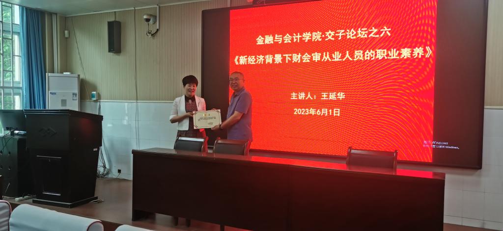 2023年6月1日下午,必赢242net官网在英才校区W102会议室举办“交子论坛”活动,本次活动特邀郑州鹏润财务咨询有限公司创始人、河南鹏润税务师事务所所长、高级会计师、执业税务师王延华作题为“新经济背景下财会审从业人员职业素养”的学术讲座。必赢242net官网部分教师及会计学专业学生代表到场聆听,讲座由副院长崔海红博士主持。