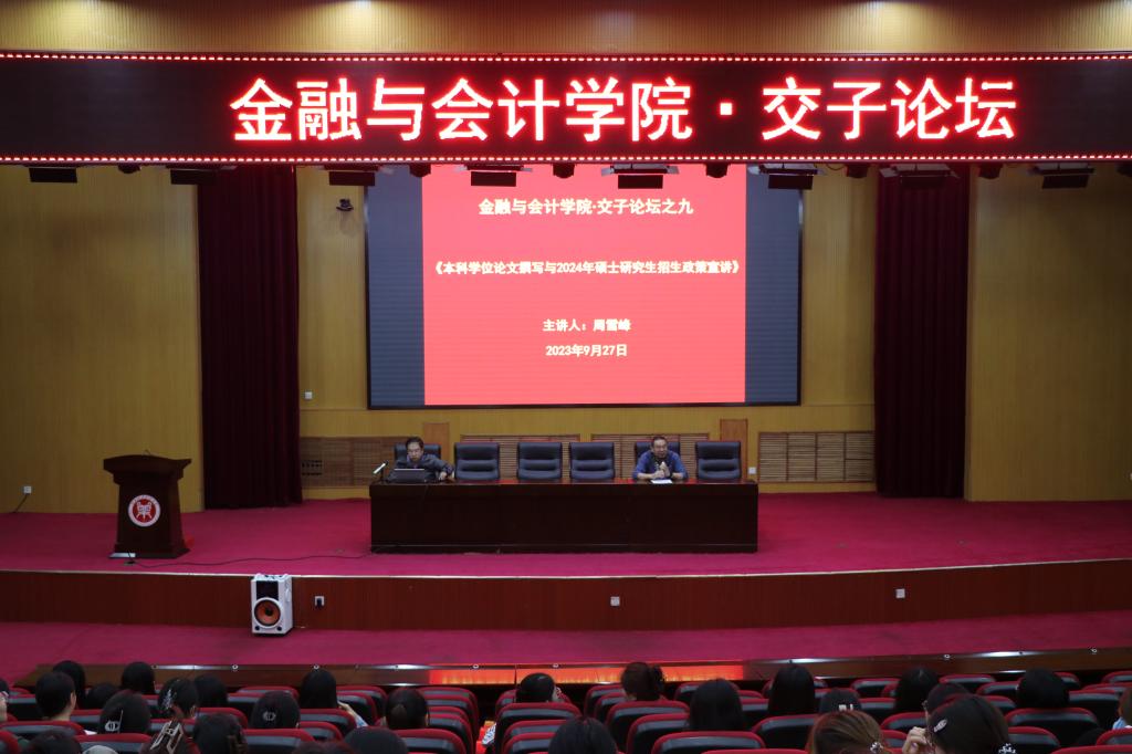 9月27日晚,必赢242net官网在英才校区学术报告厅举办交子论坛活动,本次活动特邀郑州航空工业管理学院周雪峰教授主讲,讲座主题为《本科学位论文撰写与2024年硕士研究生招生政策宣讲》。必赢242net官网副院长崔海红博士及师生代表到场聆听,讲座由院长黄良杰教授主持。