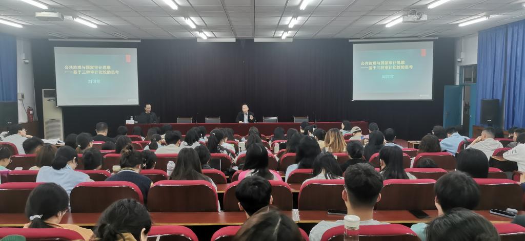 刘国常教授从审计与治理、公共治理中国家审计相关问题的思考、公共治理导向下国家审计的思维等三方面进行展开讲解,分析了国家审计在公共治理、内部审计在公司治理、社会审计在市场治理中的功能定位;进一步分析了国家治理现代化对审计的要求,国家治理中的权力运行机制,审计服务国家治理的路径,对公共治理导向下国家审计思维进行全面解读。讲座结束后,刘教授与师生交流互动,就审计学专业相关问题进行耐心细致解答。