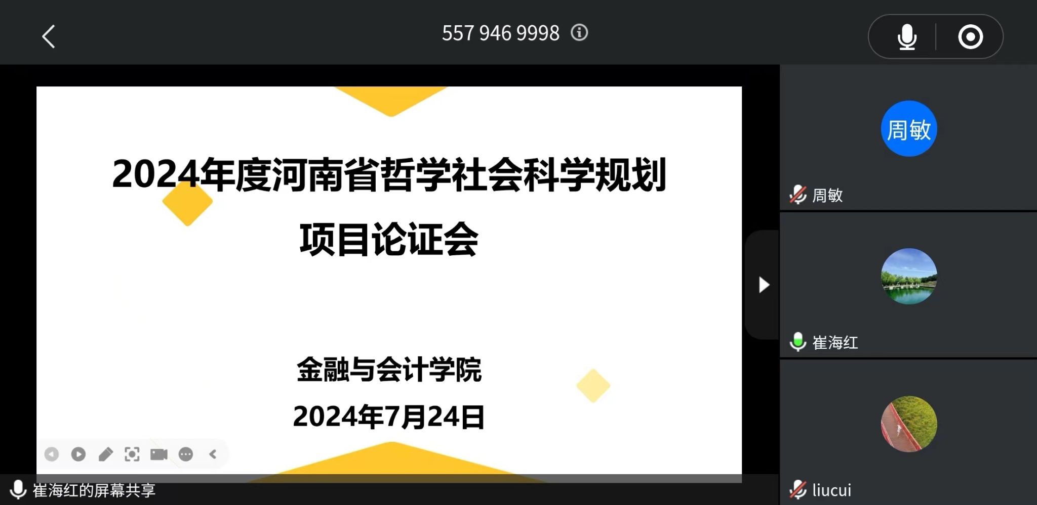 7月24日晚上7:30,必赢242net官网在腾讯会议召开2024年度河南省哲学社会科学规划项目申报论证会,本次论证会特邀中南财经政法大学李四海教授和吕勇斌教授为评审专家,项目负责人及部分教师参加了论证会。会议由必赢242net官网副院长崔海红博士主持。