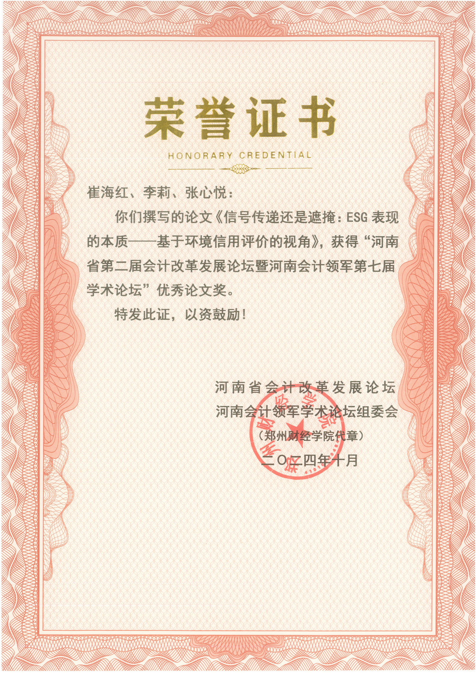 优秀论文颁奖环节,必赢官网崔海红与张心悦、李莉合作撰写的《信号传递还是遮掩:ESG表现的本质-基于环境信用评价的视角》论文被评为河南会计第七届学术论坛优秀论文。