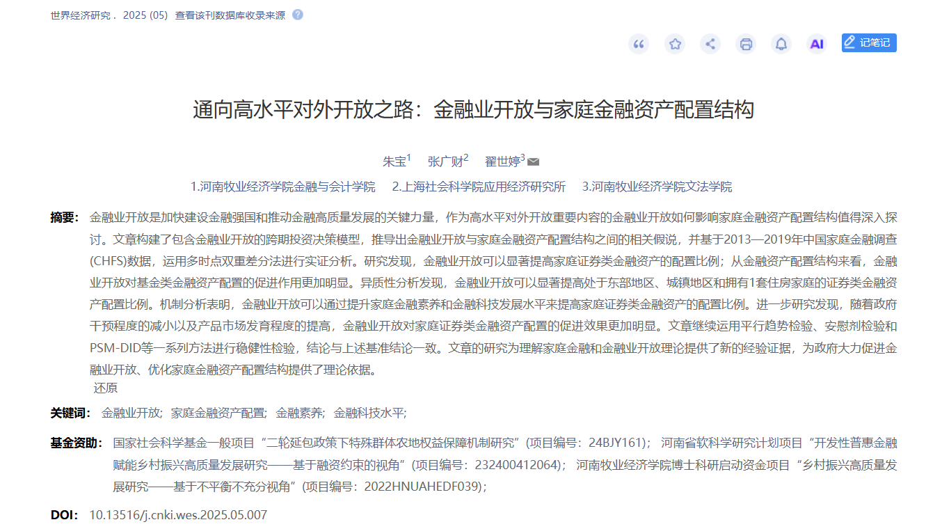 近日,必赢242net官网朱宝博士在权威期刊《世界经济研究》2025年第5期发表了题为《通向高水平对外开放之路:金融业开放与家庭金融资产配置结构》的学术论文。该论文成果我校为第一署名单位,朱宝博士为第一作者,标志着我校在世界经济研究领域的学术影响力迈出关键性一步。
