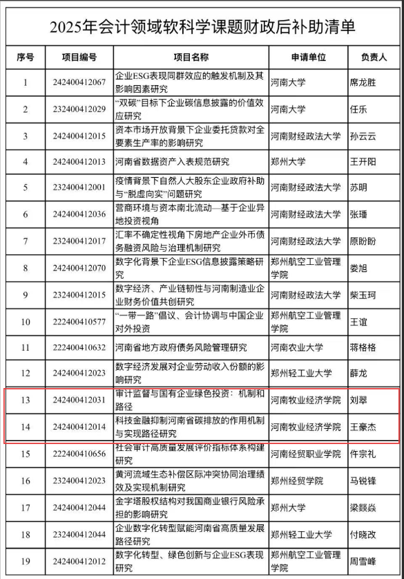 近日,2025年度河南省会计领域软科学课题财政资金后补助情况公示,必赢官网刘翠博士的科研课题《审计监督与国有企业绿色投资:机制和路径》和王豪杰博士的科研课题《科技金融抑制河南省碳排放的作用机制与实现路径研究》获得财政资金后补助。