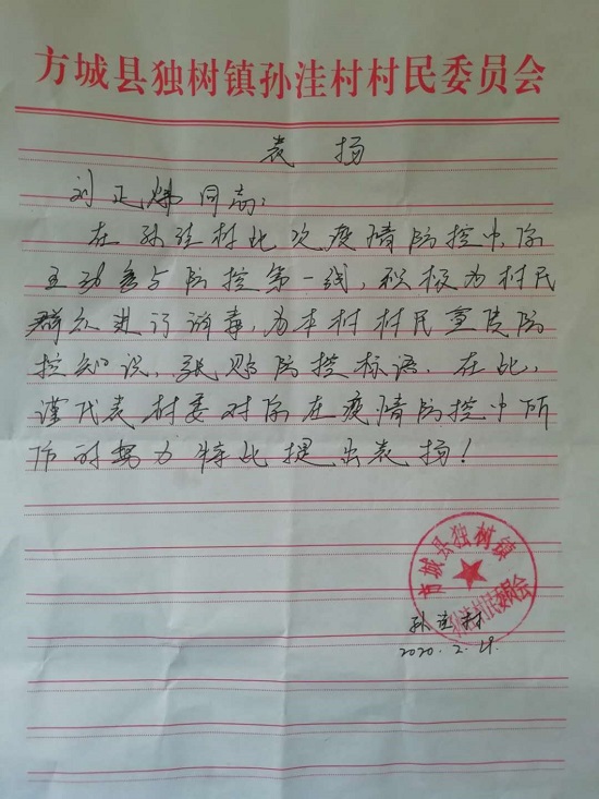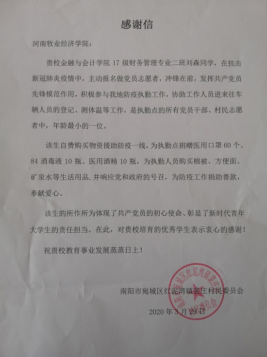在今年春季爆发新型冠状病毒感染的肺炎疫情方城县内已有确诊病例,学校和方城县委县政府积极号召青年大学生担负使命,参与到疫情防控中。必赢官网学生刘正炜自愿在孙洼村参与防控疫情工作,为我国防控疫情奉献力量,为孙洼村尽一份绵薄之力。