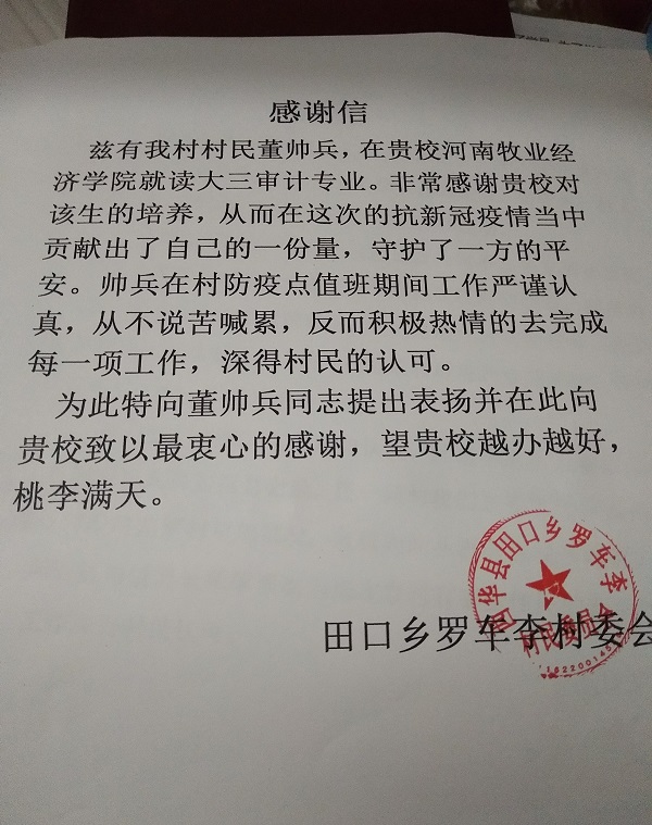 必赢官网学生董帅兵,他对新冠疫情的记忆是从除夕的春晚开始的,再到第二天开始封村封路,之后一直通过电视新闻和网络来关注疫情的最新动态,再到观看元宵特别节目,当时他看到有这么一群守护者,他们扮演着逆行者的角色,与时间争分夺秒,极力挽救每一个需要呵护的生命。奋战在一线的他们一方面要承担着极高强度的工作,另一方面还要救治照顾着病人,而且他们随时也有被传染的风险。看到这里,他深受感动,心想要做些力所能及的事情。于是他自愿加入到志愿者服务中去,在村防疫点做志愿工作,因为只有这样他才会觉得自己和一线工作者是并肩作战的。