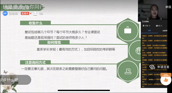 在直播讲座中,张聪果同学从考研复试中的心态、准备阶段、笔试和面试三个方面,以自己的切身经历详细给同学们讲述了备考的经验,分享了复试的心得。她认为,考研的成功来源于正确的方法、不懈的努力、良好的心态以及恰当的复习材料。整场讲述语言风趣、案例生动、条理清晰。在互动阶段,同学们就简历的准备、面试的技巧和提前调剂等问题寻求意见建议,张聪果同学一一解答,有针对性的解决同学们的问题,整场直播气氛活跃。