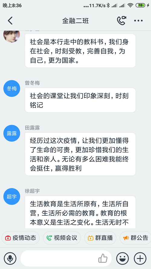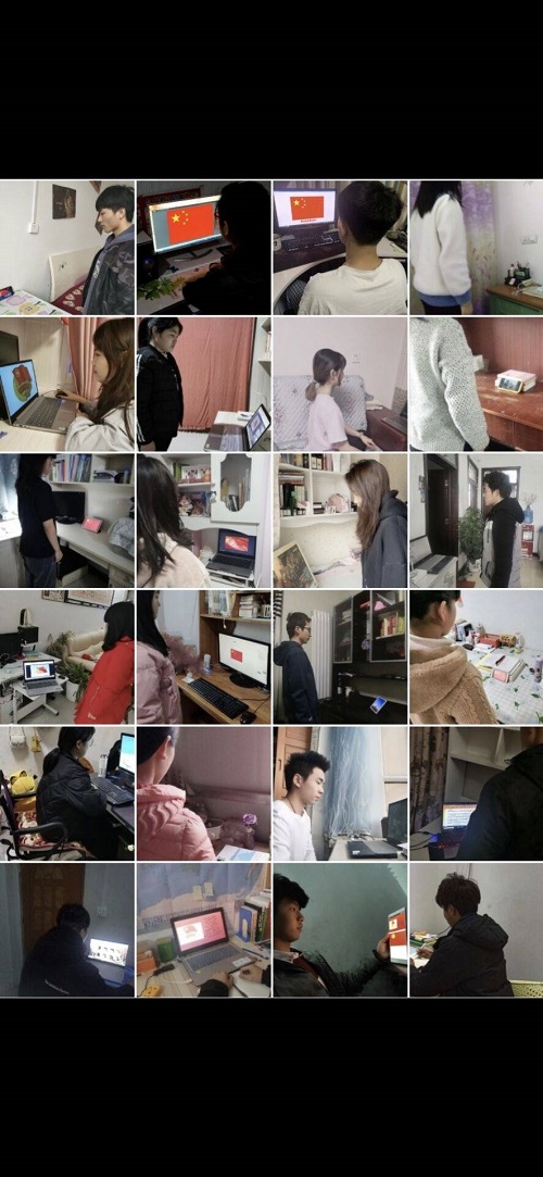 2月27日晚7:30-8:30,全院各个团支部举行了以“社会即课堂,俯拾皆教育”为主题的线上团课活动。团课伊始,全体青年学生共同参加了一次特殊的升国旗仪式。伴随着电脑、手机、电视等终端设备上传来的雄壮的国歌声,同学们面对屏幕上的五星红旗肃然起敬、心潮澎湃。在当前的疫情之下,这次“不一样”的升旗仪式,更加激发了同学们的爱国情怀。大家心怀对伟大祖国最崇高的敬意,默默为祖国母亲加油、为湖北武汉祈福。升旗仪式过后,各个团支部用文字、图片、语音、视频等多种形式围绕“习近平总书记讲话”及“郑邦山厅长讲话”开展学习讨论,并结合“青年大学习”共同分享学习心得。团课最后,各支部还采用问卷调查的形式组织全体青年学生填写了关于新冠病毒防疫知识和爱国爱党相关主题的知识竞答问卷,以提高同学们的防疫意识。