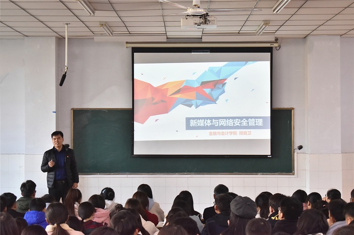 会议伊始,顾老师先介绍了本次培训主题选取的目的和意义,并通过一组数据向大家展示了目前我国网民数量,进而引出本次讲座正题。正文部分,顾老师从新媒体的发展历程、新媒体的特点、新媒体的类型等方面向大家全面介绍了新媒体的概念,促进了大家对新媒体的了解。接着,顾老师主要从个人信息泄露、不良信息传播、网络病毒传播、钓鱼网站威胁四个方面向大家讲解了网络安全有关问题。在讲解每个问题时,顾老师选取了社会关注度高且和大家日常学习生活关系密切的例子进行印证,提高了大家的听课热情,强化了大家的安全意识。最后一个部分,顾老师重点讲解了《中华人民共和国网络安全法》相关条例,加深同学们对网络安全法律法规的认识。最后,他希望同学们能够意识到网络安全管理的重要性,正确使用网络,避免财产损失。