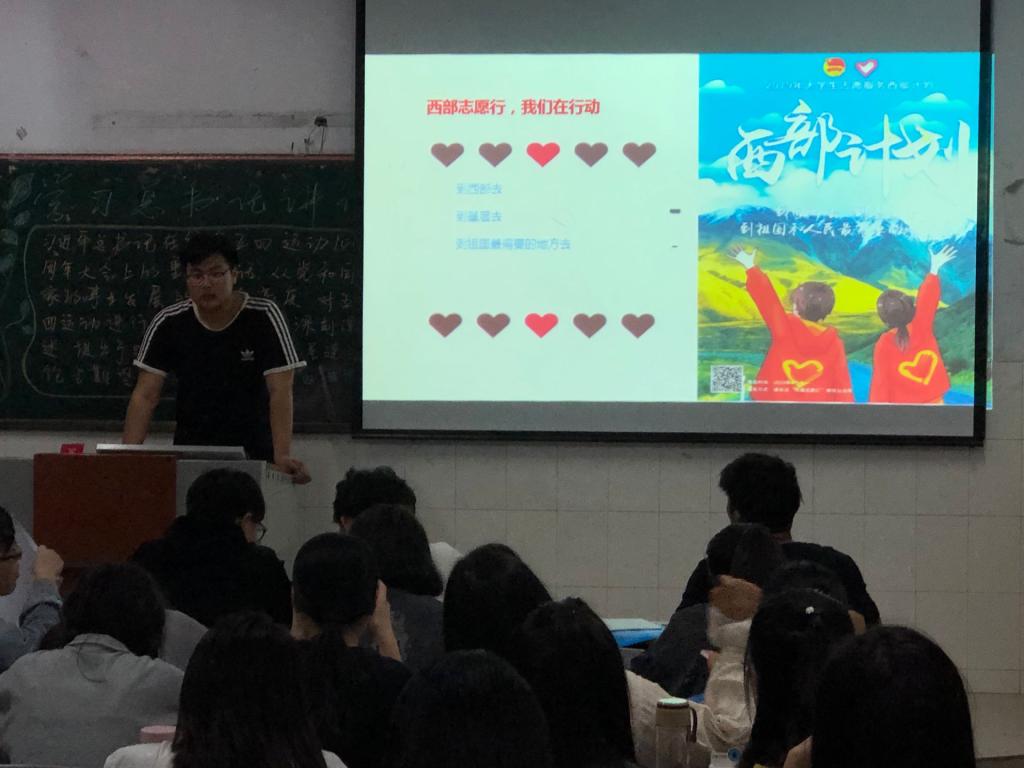 为进一步做好大学生志愿服务西部计划工作的宣传动员,增强青年学生对西部计划相关政策的全面了解和认识,金融学院于2019年5月9日晚上19:00点开展了“西部志愿行,我们在行动”宣传推介活动。全院学生以班级为单位开展了此活动。