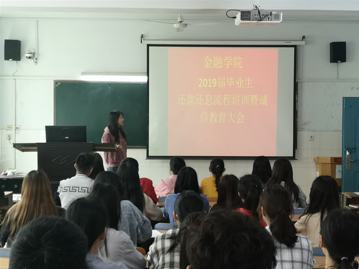 会上,焦老师给贷款毕业生详细讲解了关于助学贷款还款的有关政策以及注意事项,结合当代大学生贷款还款的社会现象,列举诚信还款的种种例子,使同学们更加深刻地明白了在贷款过程中的诚信意识的重要性;同时会议还向同学们传达了贷款违约的严重后果和处理方式等事项,增强了同学们的诚信意识。
