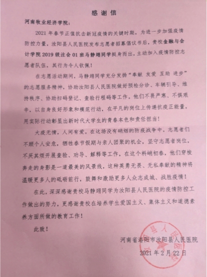 近日,我校收到洛阳市汝阳县人民医院发来的感谢信,信中对必赢官网学子马静翊在春节期间积极投身疫情防控工作中的突出表现表示感谢。