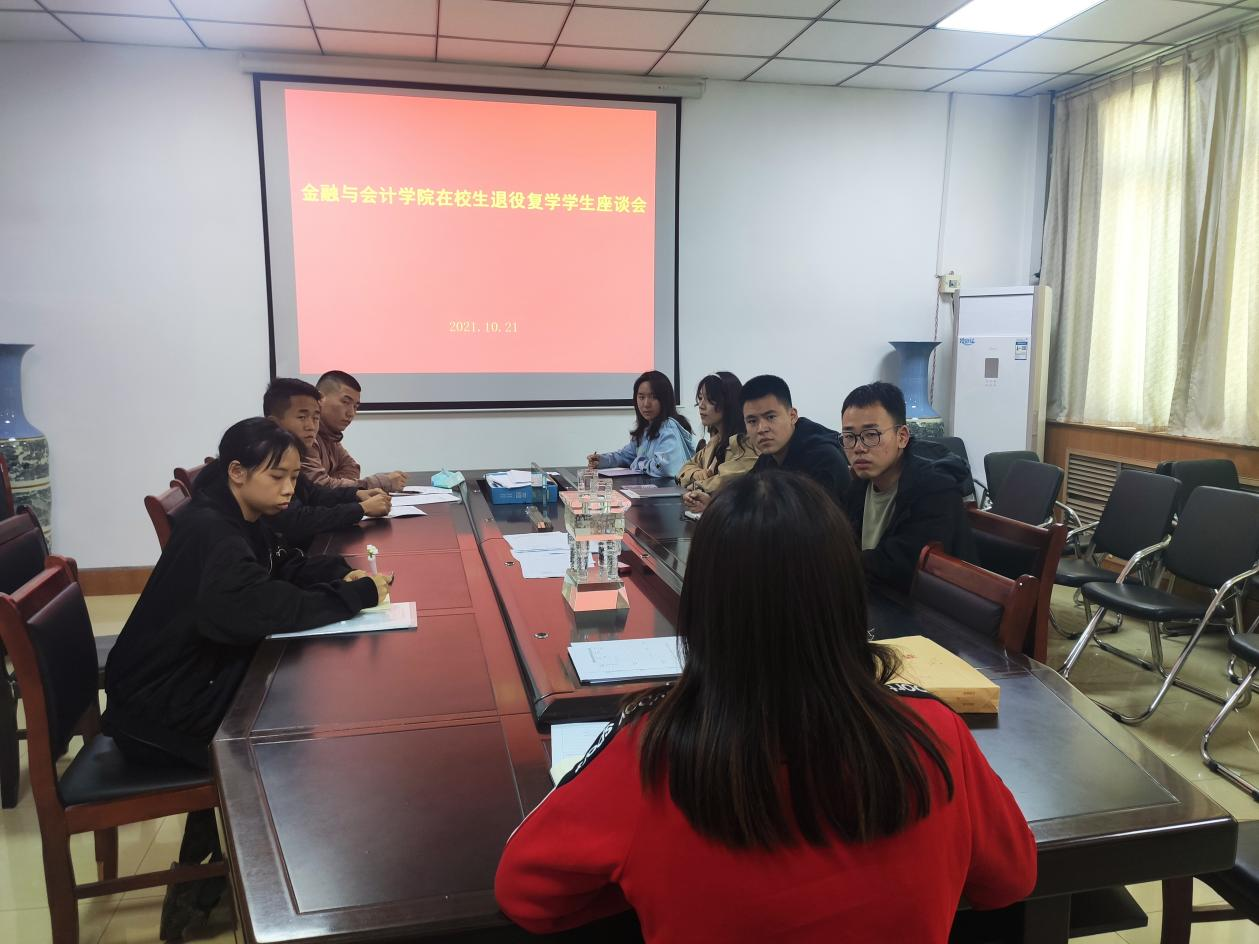 为更好的了解必赢官网退伍复学学生学习、生活和思想状况,帮助解决退伍复学学生学习、生活中的实际困难,进一步推动我校国防教育工作的顺利开展,10月21日下午14:10,在院办会议室514召开了2021年在校退伍学生座谈会。武装专员邓桐玲老师和7名退役学生进行了沟通座谈。