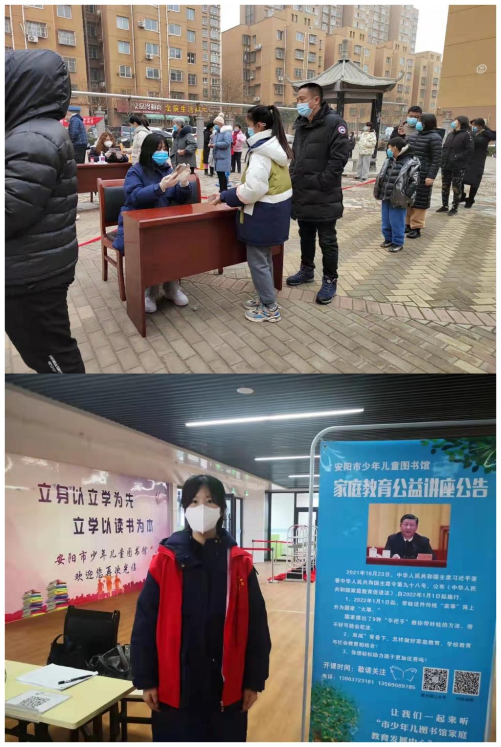张梦涵同学的家乡是安阳市,安阳是本轮疫情的中风险地区。得知疫情暴发后她积极参与志愿服务,在安阳市少儿图书馆的门口检查进馆人员的健康码和行程卡并且提醒大家戴口罩,并且在全民做核酸中积极协助社区工作,有序为市民录入个人信息,以保证大家的身体健康。通过志愿服务,她真切体会到了抗疫工作人员的辛苦与做志愿者的意义,同时也在但当中得到了历练,在责任中成长。