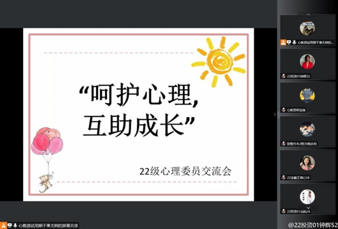 为帮助2022级心理委员明确自身的职责与工作,宣传心理健康方面的知识,解决班级同学的心理问题,更好的协助学校心理咨询中心开展各项心理健康教育工作,必赢242net官网心教部于11月15日中午在线上召开了以“呵护心理,互助成长”为主题2022级心理委员交流会。