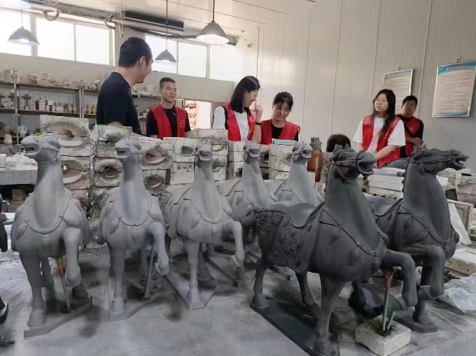 中国陶瓷史上最绚丽的艺术精华唐三彩,大家并不陌生,但是唐三彩的制作工艺相信大家并不十分了解。下午,在国家级非遗传承人高水旺老师的儿子高哲先生的带领下,队员们前往唐三彩博物馆参观学习。高老师详细为队员们讲解唐三彩的文化,包括三彩的颜色、高岭土原料及制作工艺。走进唐三彩的工厂车间,队员们近距离观察唐三彩整个工艺流程,塑形、素烧、施釉、釉烧,每一步都需人工亲自操作,这让人不禁对古时唐三彩烧制肃然起敬。