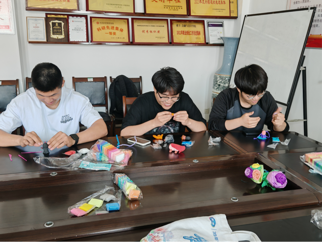 活动现场气氛热烈,首先进行的是手工花朵制作。五色的彩纸,在学生灵活的指尖翻转折叠。大家全神贯注,有的仔细比对花瓣形状,有的精心调整花朵层次,同学们相互交流技巧,分享创意,不一会儿,娇艳纸花纷纷诞生。参与活动的学生表示“花朵象征美好,希望同学们像花朵般,用劳动创造美好。”随后还有粘土手工制作环节,柔软粘土在学生手中不断变换形态,创意无限。有的人用粘土塑造出辛勤劳作的农民形象,有的人制作出精巧的劳动工具模型。同学们充分发挥想象力,把对劳动的理解融入作品。一位同学兴奋地展示自己的粘土作品说:“原来劳动也能这么有趣,我用粘土做出了心中劳动者的样子。”