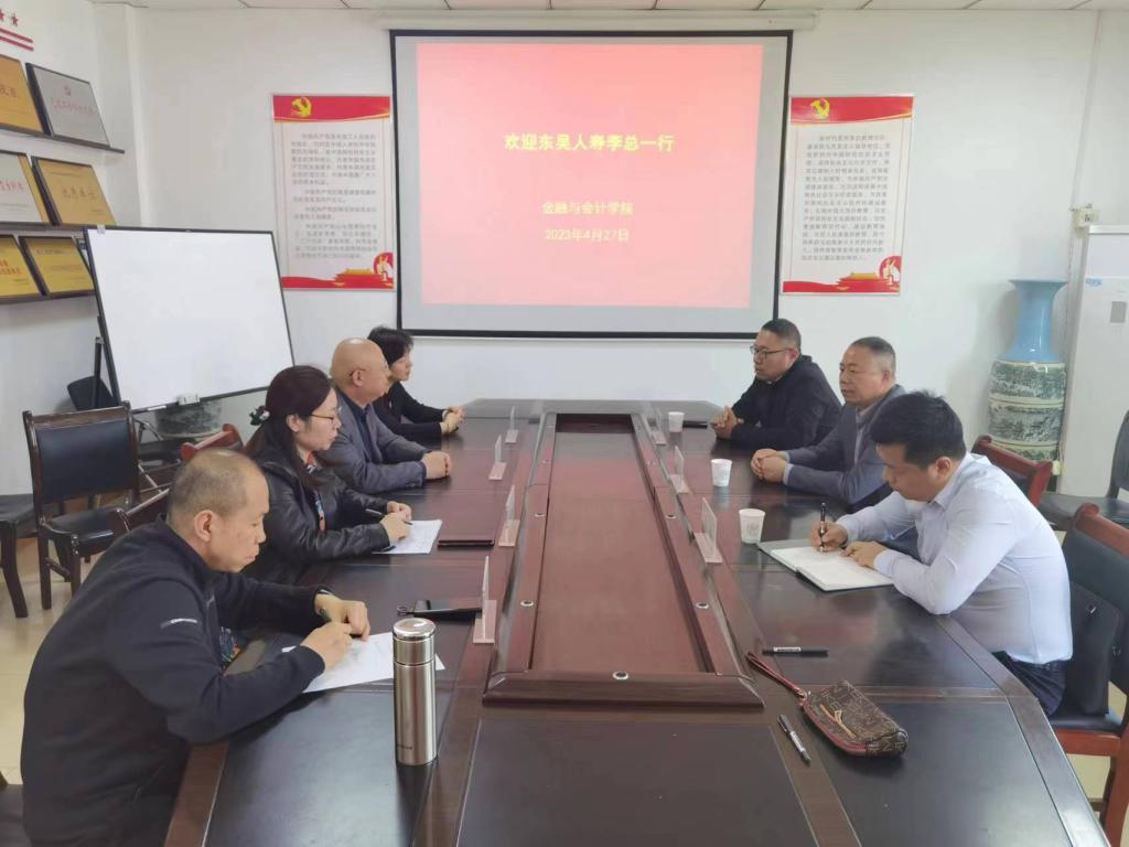 2023年4月27日上午,东吴人寿河南省分公司副总经理李强与高雷(东吴人寿河南省分公司团险部经理)、陈晨(东吴人寿郑州市公司团险部经理)等一行三人来到我校必赢242net官网,与学院党委书记陈复昌、院长黄良杰、副院长邵翠丽、王培玲及保险专业负责人张智勇老师进行了深入交流。