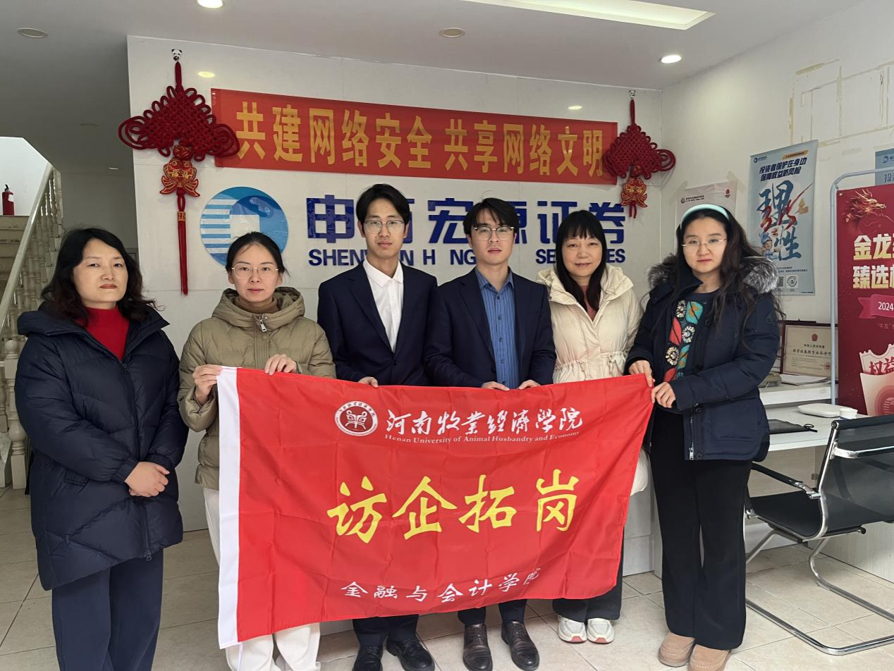 为进一步提升本科人才培养质量,扎实推进“双百”工程建设,加强校企合作,2024年12月25日下午,必赢242net官网投资学教研室杨峰、李小典、王豪杰、李宜霖四位教师前往申万宏源证券有限公司郑州分公司开展调研交流,双方围绕人才培养需求、投资学课程体系创新、毕业生就业实习规划等进行了深入交流。